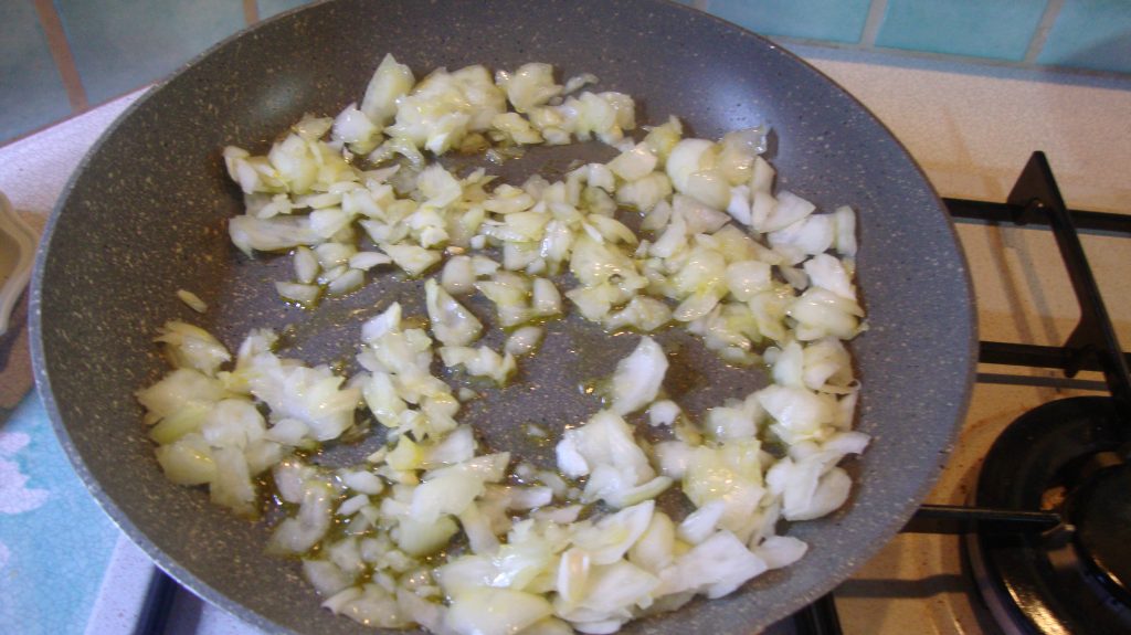 • É hora de preparar o molho de limoncello. Em uma panela antiaderente, coloque um fio de azeite e as cebolas picadas, e refogue por 2 minutos.