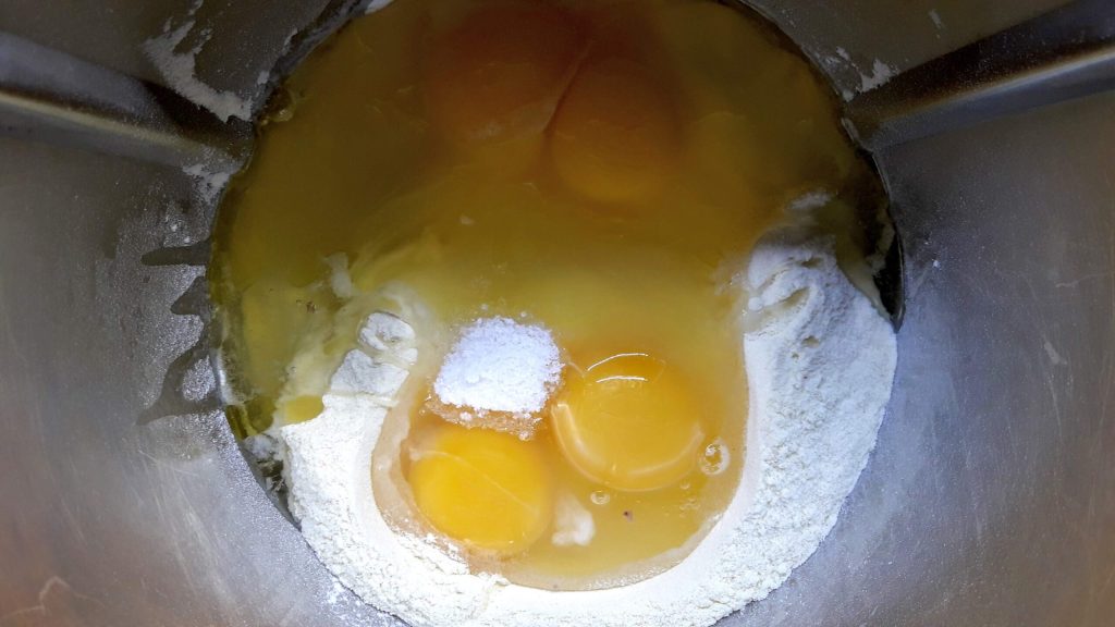 e misture com o garfo ou com a batedeira, os líquidos, começando do centro e depois incorporando aos poucos toda a farinha, quando os líquidos forem absorvidos e você tiver uma massa cremosa, adicione o leite.