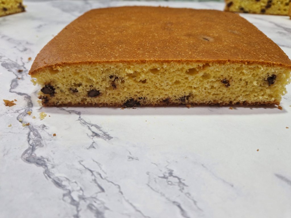 Retire o pão-de-ló da forma e faça cortes para deixá-lo quadrado, como na foto. (eu sei que poderia ter assado direto em forma quadrada, mas para aquela quantidade a minha forma era grande demais, então optei por uma redonda) com os restos eu decorei as zuppette e fiz café da manhã.
