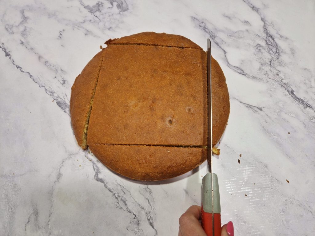 Agora corte o pão-de-ló ao meio e depois em 3 camadas.