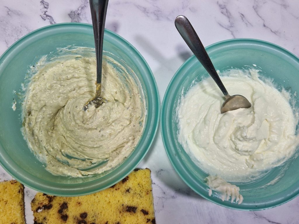 Assim você deixa pronto o recheio dos morangos, enquanto para o de pistache você adiciona a farinha de pistache. Misture bem com um garfo para evitar grumos.