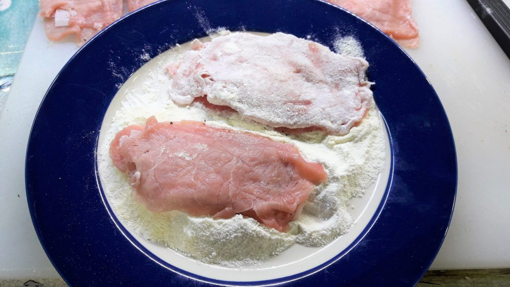 • Neste ponto, em um prato, coloque a farinha e empane as bistecas.