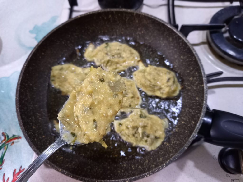 Em uma frigideira, coloque azeite de oliva extra virgem e aqueça, em seguida, pegue a mistura com colheres e coloque na frigideira.