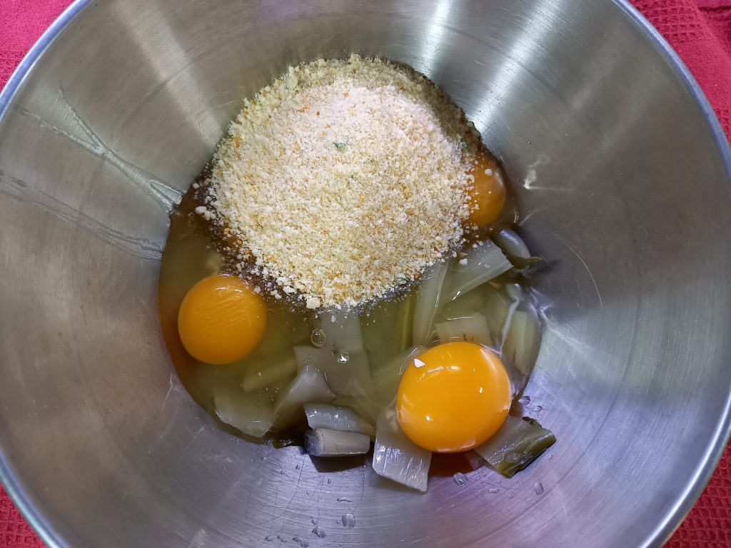 Decorrido o tempo, coloque-os em uma tábua de corte, corte em pedaços, transfira para uma tigela, adicione 2 ovos, 100g de farinha de rosca, 1 dente de alho, um punhado de salsinha picada, 30g de pecorino ou parmesão, uma pequena pitada de pimenta. Misture bem.