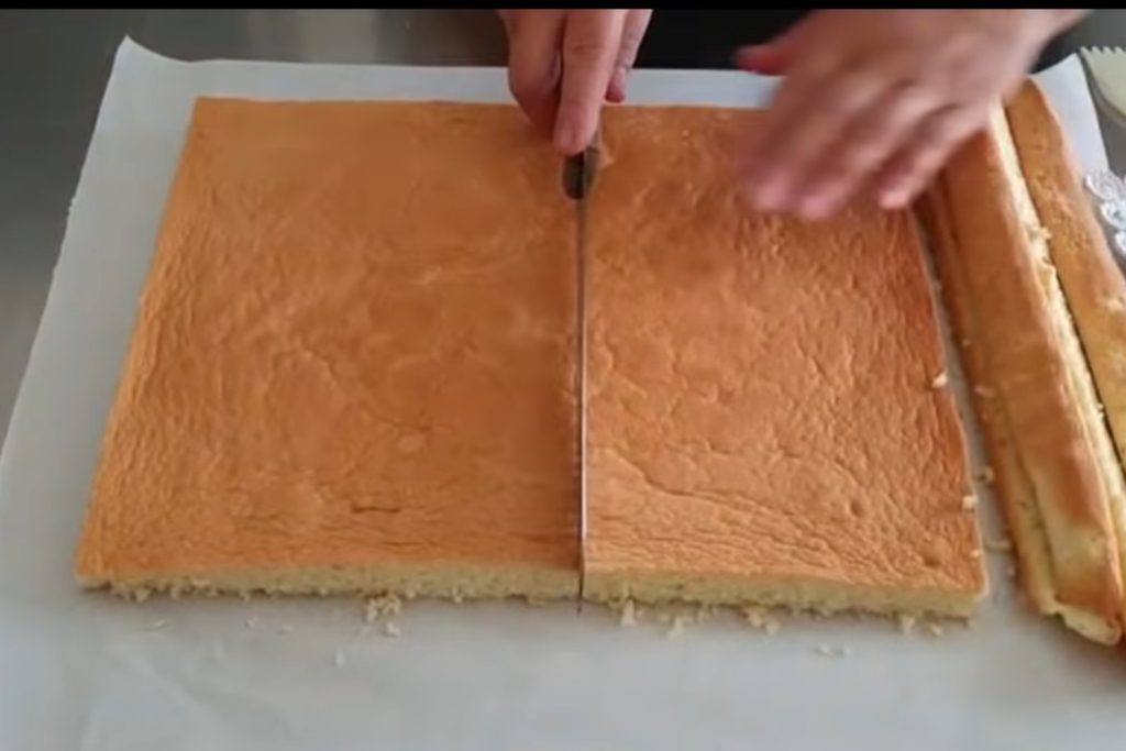 Corte o pão de ló nos 4 lados, depois divida-o ao meio no sentido horizontal e crie assim 2 bases.