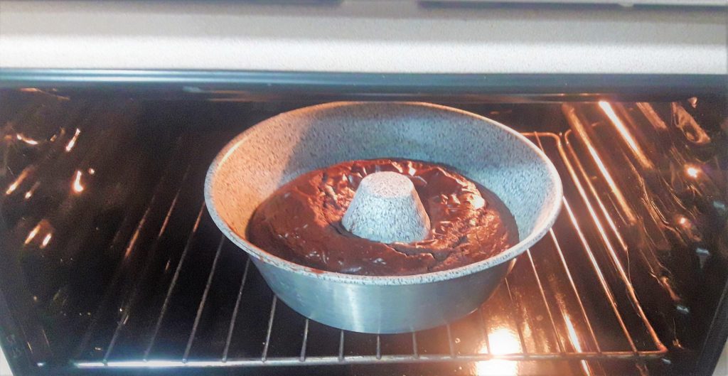 Em seguida, asse no forno estático a 170°C por 40 minutos. Depois, abra a porta e faça o teste do palito; se sair seco, desligue e deixe descansar na grade por 5 minutos.