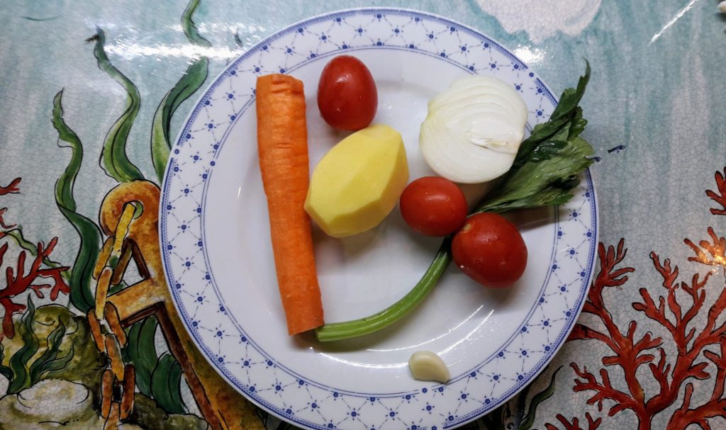 Descasquei a batata, a cebola, a cenoura, o dente de alho, lavei os tomatinhos e o aipo, deixei inteiros