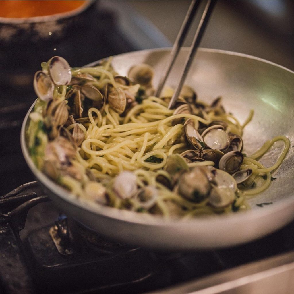 • Quando a massa estiver quase cozida, adicione as vongole e cozinhe por mais 2 minutos, sempre mexendo.