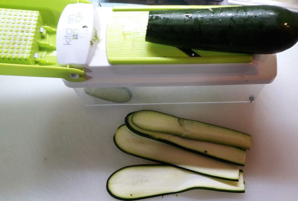 • Fatiamos a abobrinha com o cortador, cuidado com as mãos.
