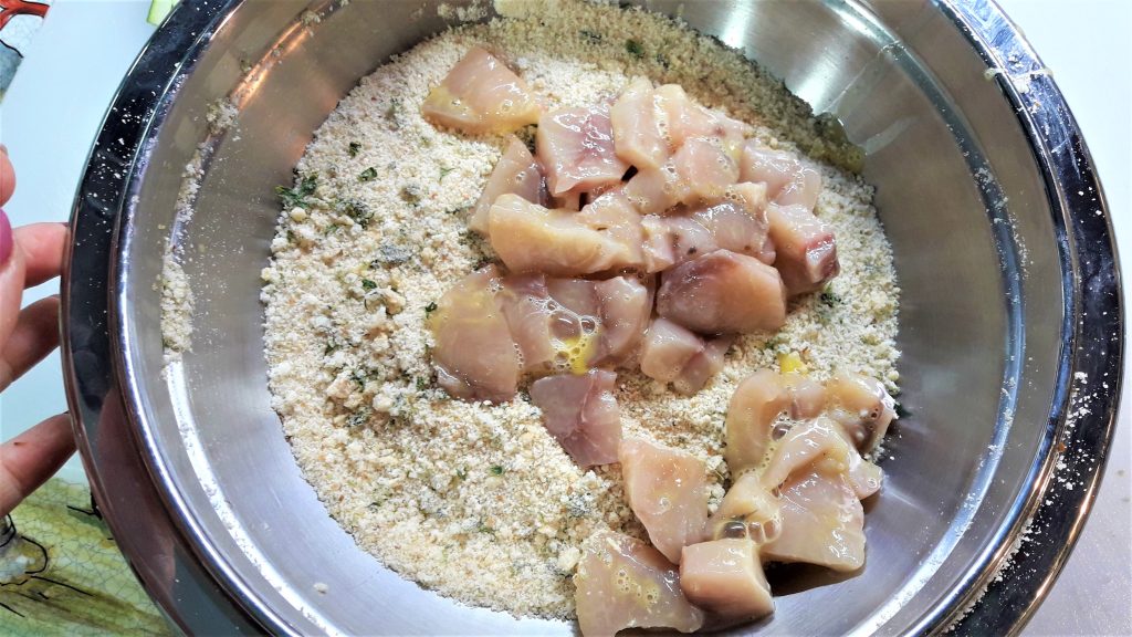 As abobrinhas e os tomates cereja e o peixe são empanados na farinha de rosca temperada ao estilo siciliano, e assados no forno, mas como alternativa, para os amantes de frituras, você também pode fritá-los na frigideira ou na air fryer.