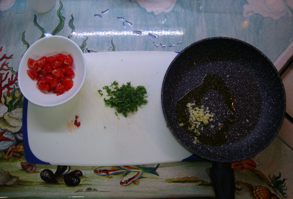 Reduza os tomatinhos em pedaços, pique a salsa e 1 dente de alho em pedaços pequenos, e coloque-os em uma frigideira junto com um fio de azeite.