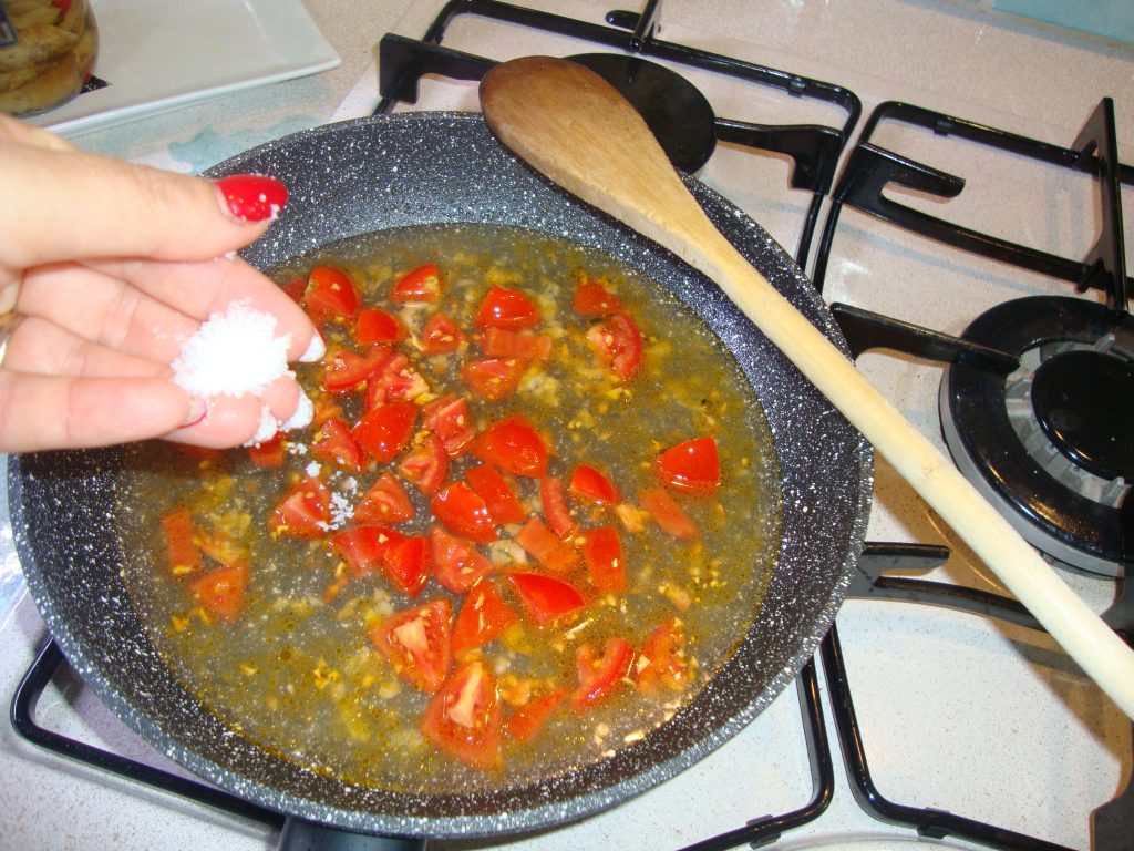 Em uma frigideira antiaderente, coloque 2 colheres de sopa de azeite evo e doure o alho suavemente, depois adicione os tomatinhos e a pimenta sem sementes.