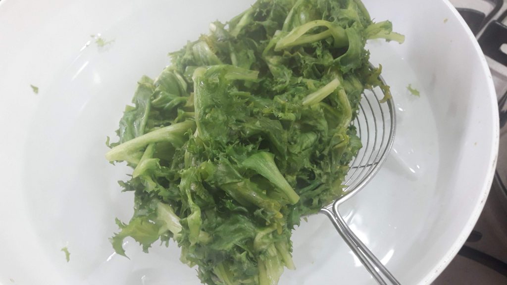 Quando ferver, coloque a escarola e deixe cozinhar por apenas 4 minutos, enquanto isso, prepare uma tigela com água fria e gelo.