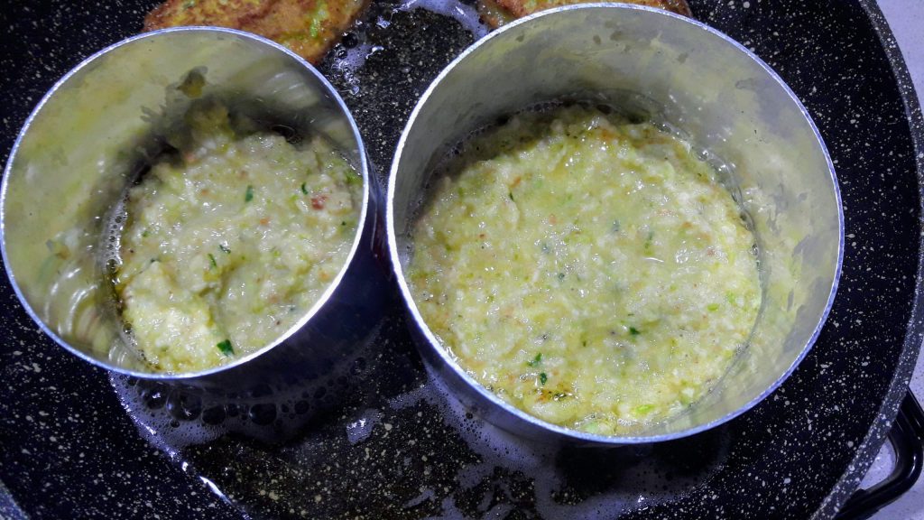Unte com óleo os cortadores de biscoito e coloque-os na frigideira, quando o óleo estiver bem quente comece a despejar um pouco de composto em cada um.