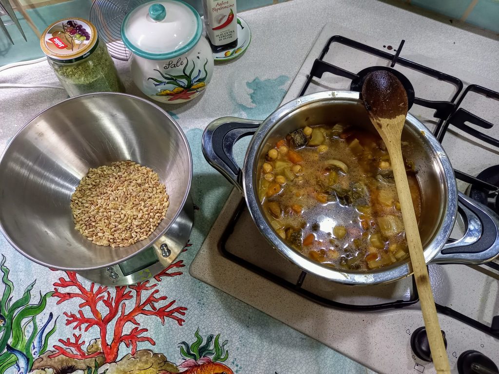 Aqui está pronto o Minestrone enriquecido com grão-de-bico e cereais, em cozimento com Bimby TM6.