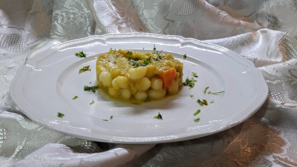 Aqui está o Nhoque com creme de alho-poró e peixe-espada
