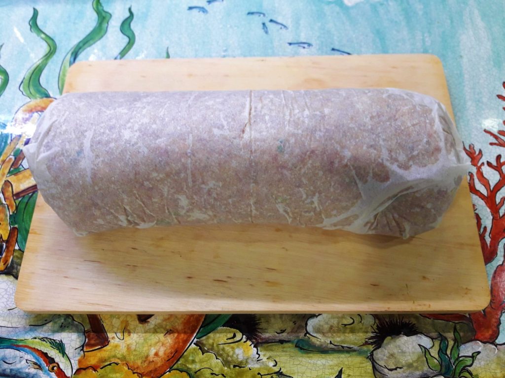 Polvilhe com os temperos e, com a ajuda do papel manteiga, enrole o bolo de carne bem firme, terminando com as extremidades em formato de bala.