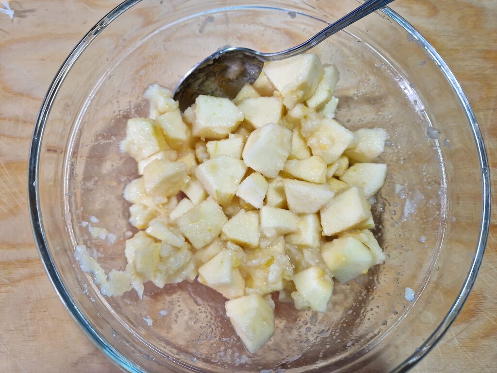 Em uma tigela coloque as maçãs descascadas e cortadas em cubos, esprema um limão, e adicione a geleia, eu usei de limão, você pode usar a que quiser.