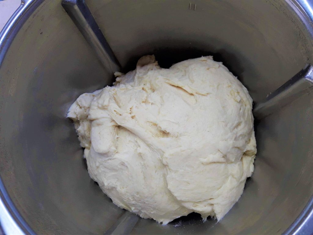 Adicione agora no copo pela abertura enquanto está girando em modo espiga a manteiga macia, ou a banha, aos poucos, o leite, o licor strega, ou o limoncello, raspas de limão e os 2 sachês de vanilina, e amasse tudo até obter uma massa homogênea