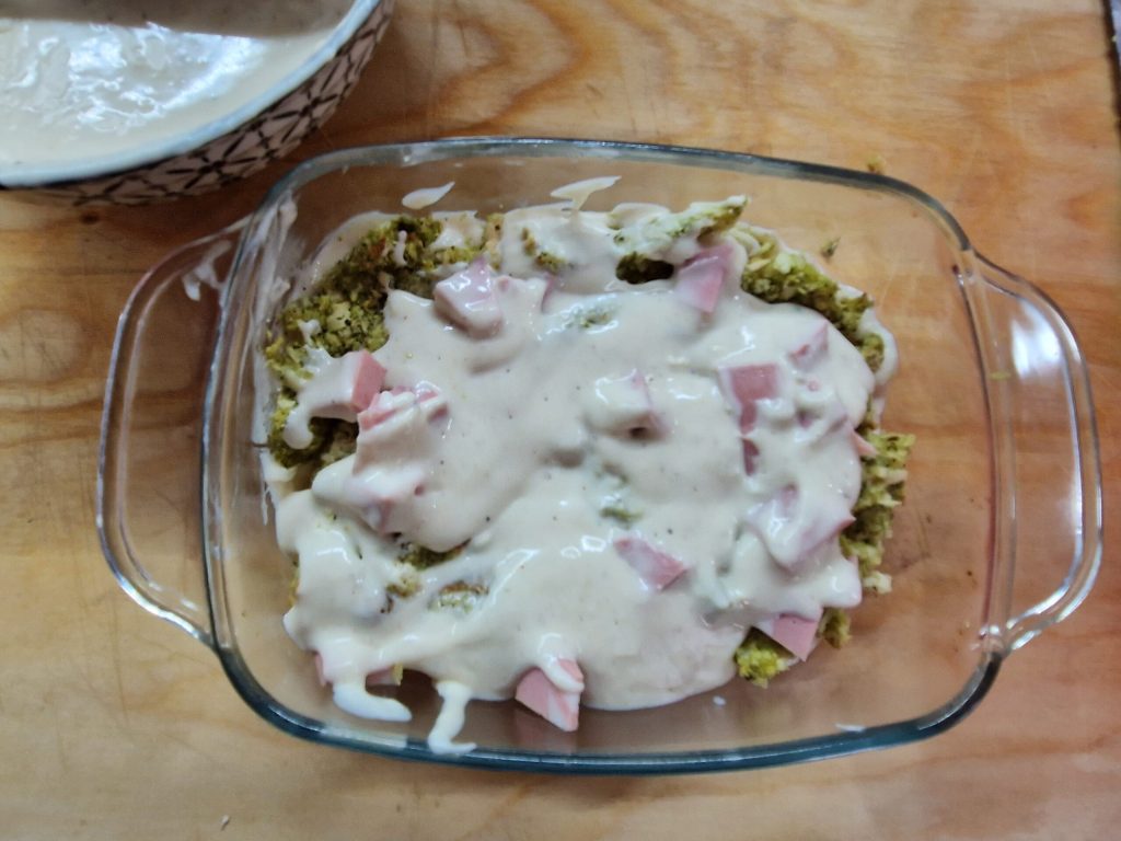 depois coloque um pouco de bacon ou presunto, o que você encontrar na geladeira e