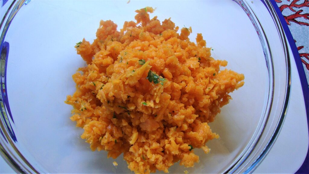 Coloque no copo do Bimby os cubos de abóbora e triture por 20 seg vel 8. Recolha com a espátula e se houver pedaços grandes, repita a operação.