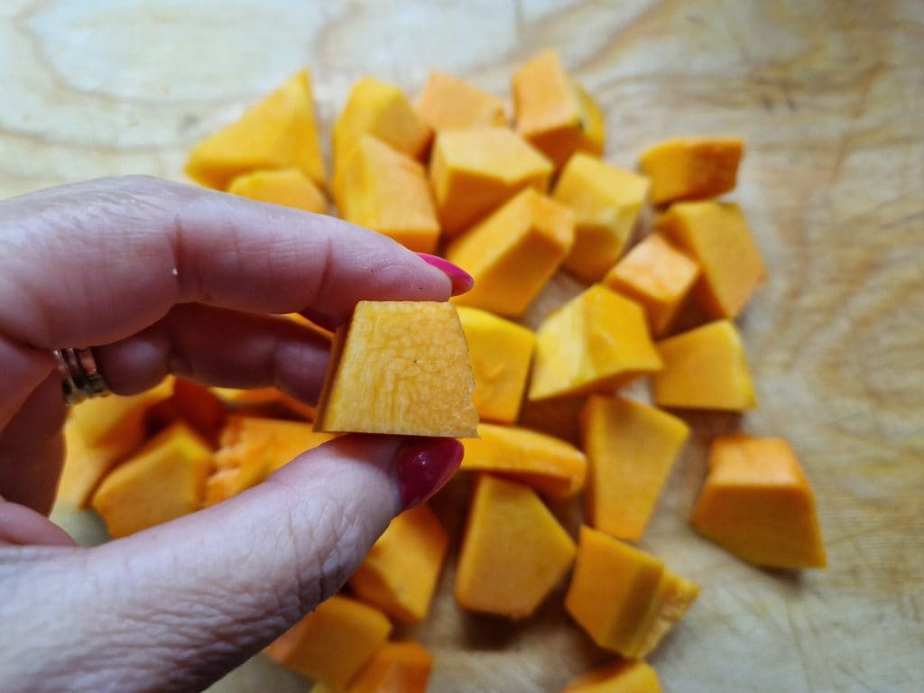 Enquanto isso, pegue uma abóbora, retire a casca, retire também as sementes. Corte-a em cubos de cerca de 1 cm e reserve.