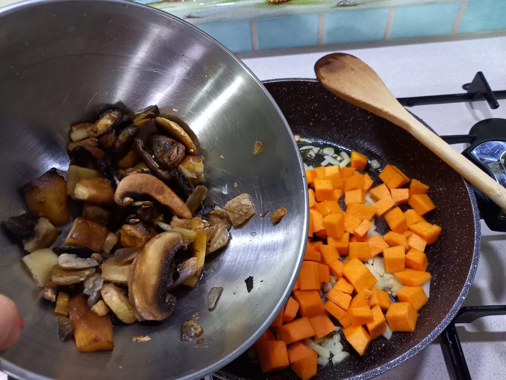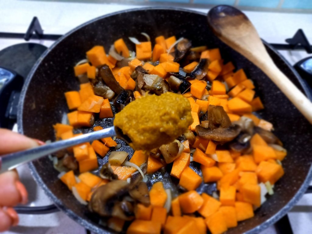 No final do cozimento, misture a abóbora com o molho de cogumelos, disponha em um prato de servir ou em uma frigideira à vista junto com os ovos.