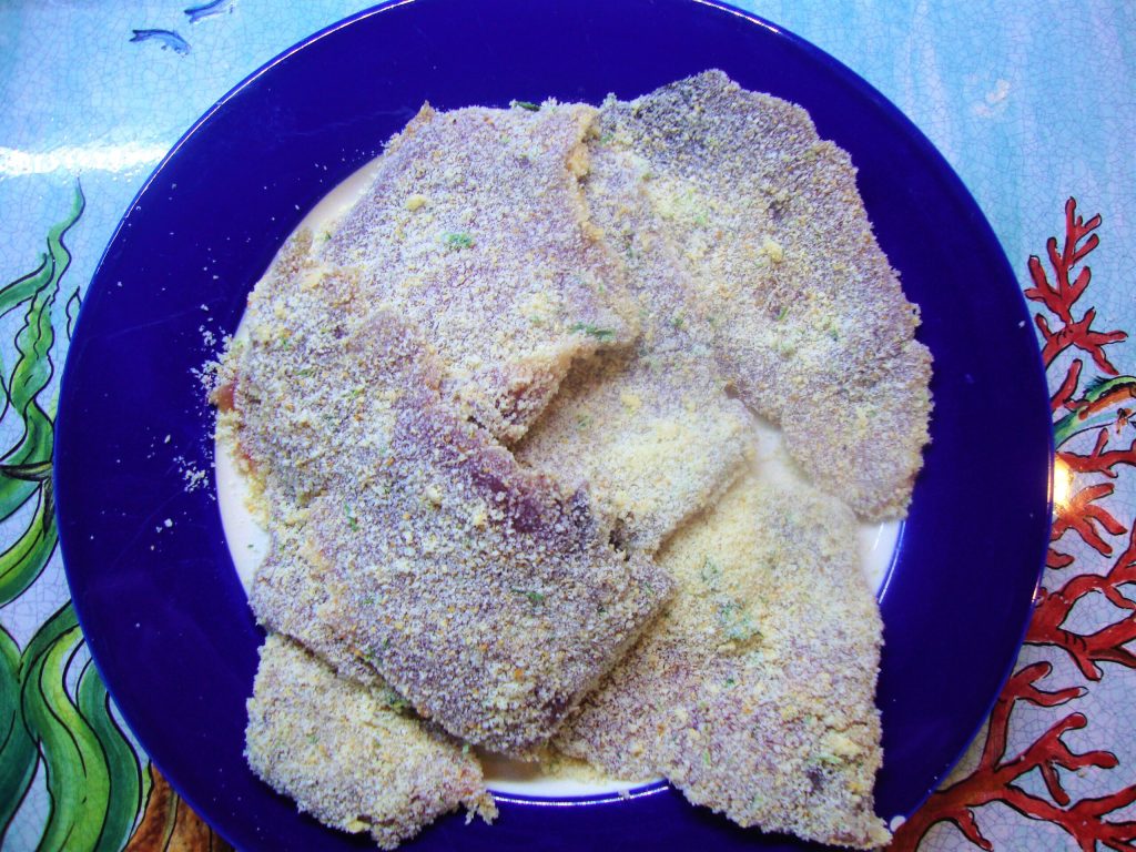 Molhe cada fatia primeiro no ovo e depois na farinha de rosca temperada à siciliana,