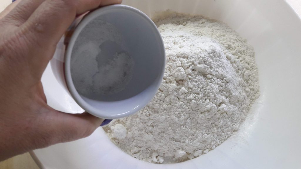 Em uma tigela bastante larga ou em uma superfície, coloque a farinha,