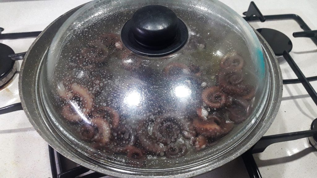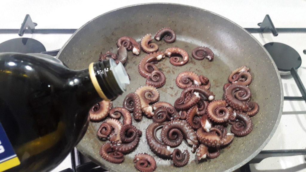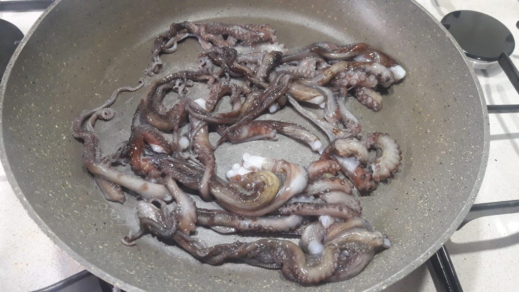Aqueça bem uma frigideira antiaderente e, assim que estiver quente, coloque os tentáculos; você vai ouvir o chiar.