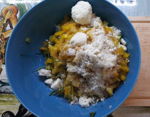 Em uma tigela, misture os pimentões, as abobrinhas, o pecorino romano ralado e os temperos que você picou pouco antes