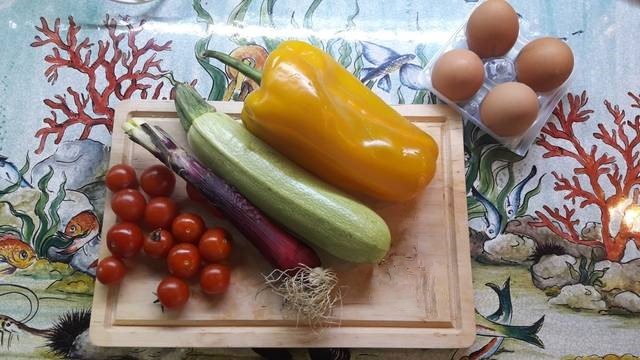 Bem, hoje eu tinha 2 ovos não fritos e vegetais livres. E além disso sem óleo, com 50 gramas de pão… Que tristeza. Eu disse não! Vamos transformar esta refeição em algo não só gostoso, mas também bonito. Não usei óleo, a única “gordura” permitida é o pecorino, mas apenas 20 gramas para 2 pessoas.