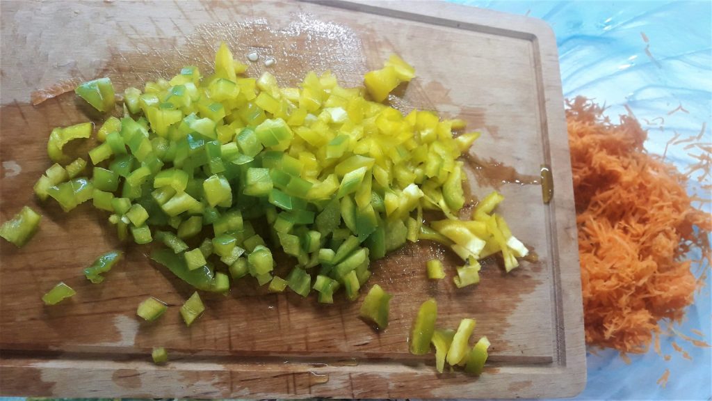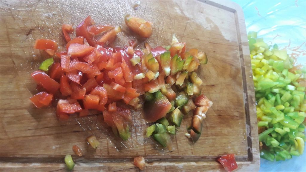 • Corte em quadradinhos pequenos os meios pimentões, amarelo, verde…