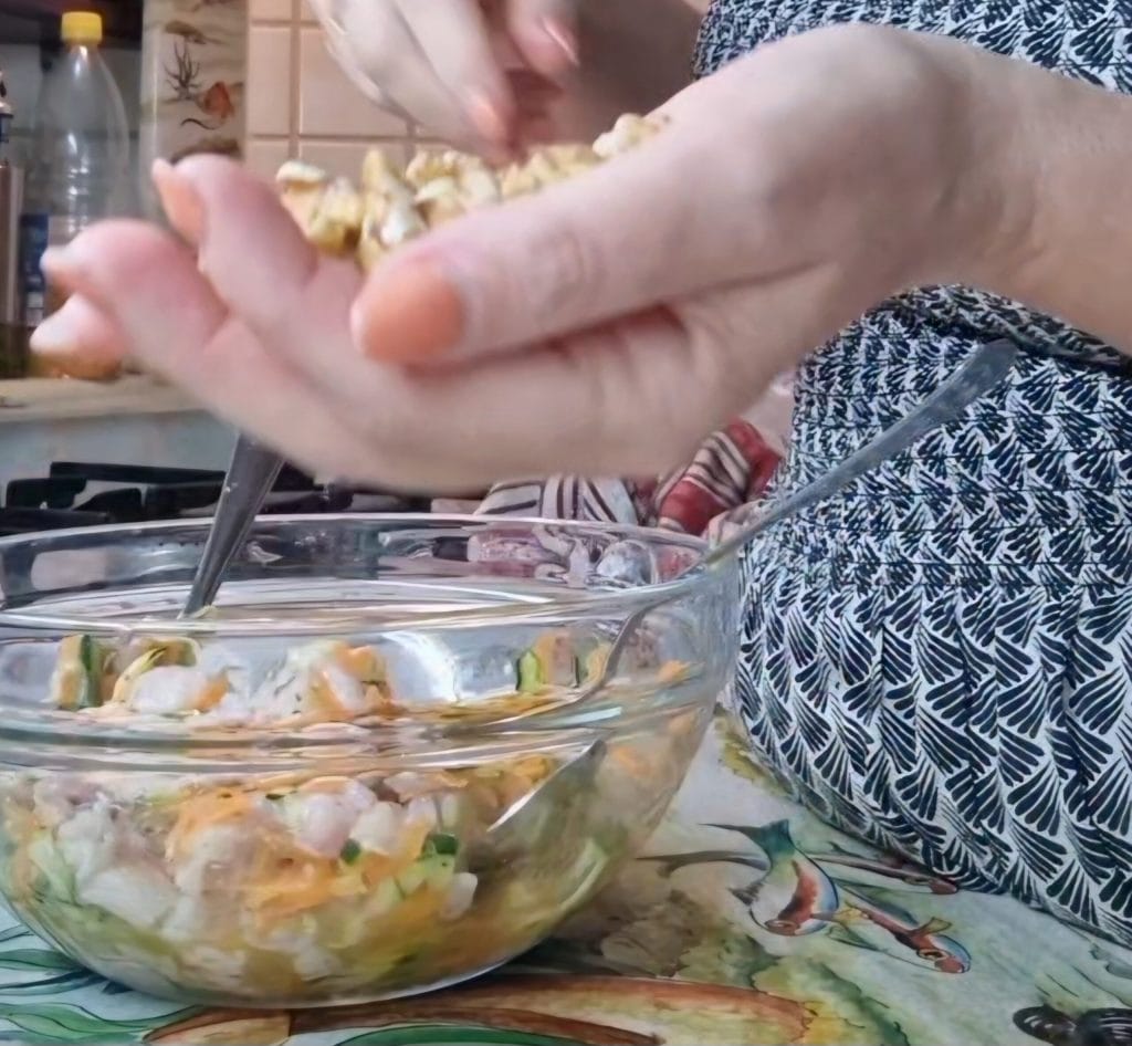 Passado o tempo, escorra tanto o peixe quanto os legumes da marinada, e misture-os em uma tigela de vidro.