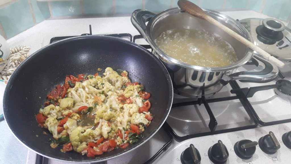 • A 3/4 do cozimento, retire-a com a mesma escumadeira e adicione à couve-flor, termine o cozimento sempre no fogo e, se secar, pode adicionar um pouco mais da sua água.