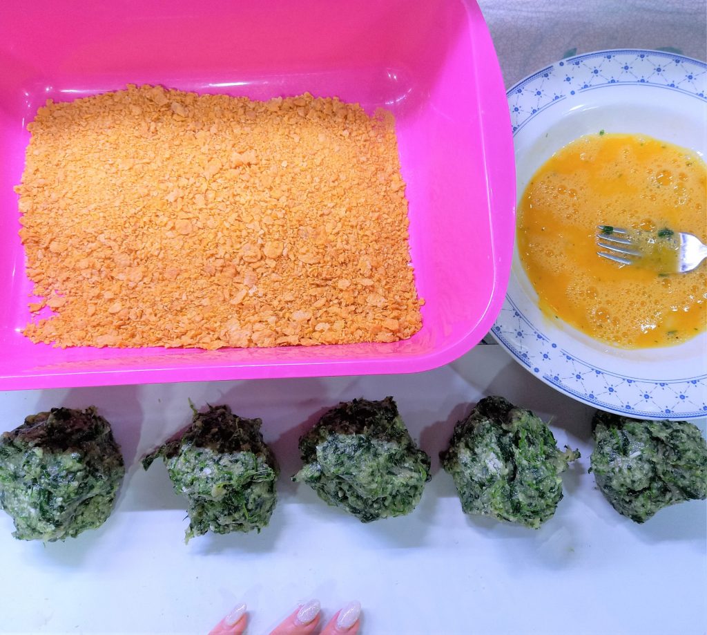 • Divida a mistura em 5 bolinhas e forme almôndegas. Bata os outros 2 ovos em um prato.