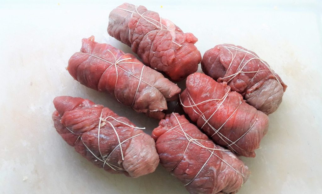 - 6 fatias bovina adulta ou vitela, capa de baixo, capa de cima (cortadas bem finas e bem largas)