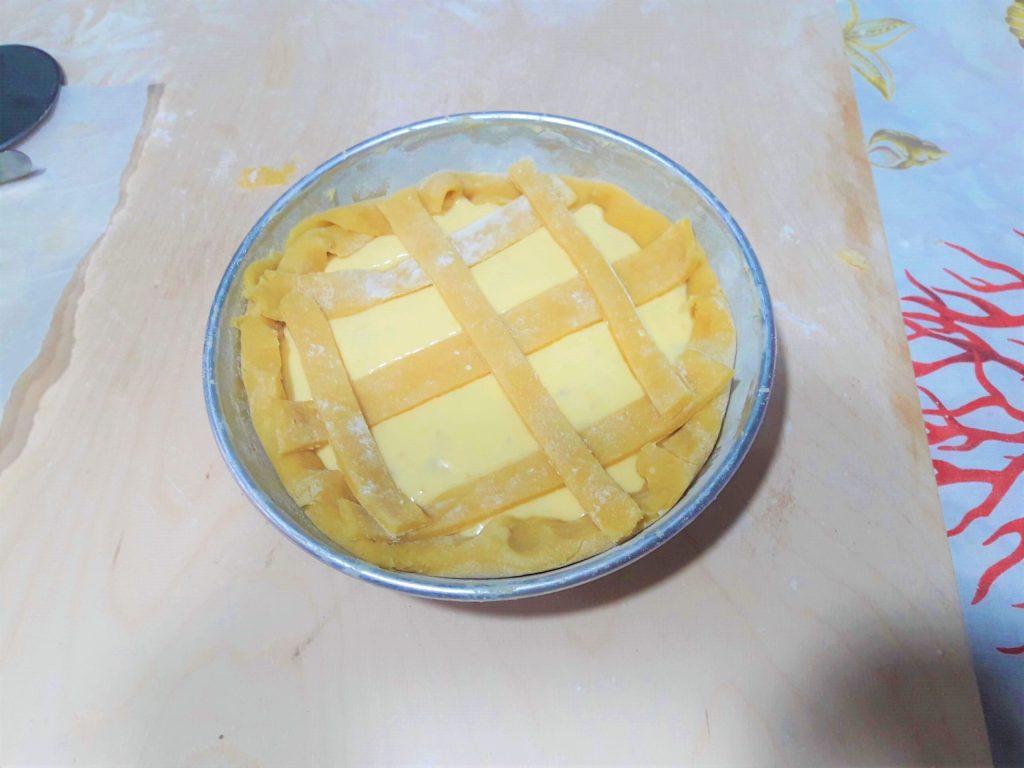 Agora amasse os retalhos e crie com um cortador de massa tiras que você colocará sobre a torta cruzando-as entre si.