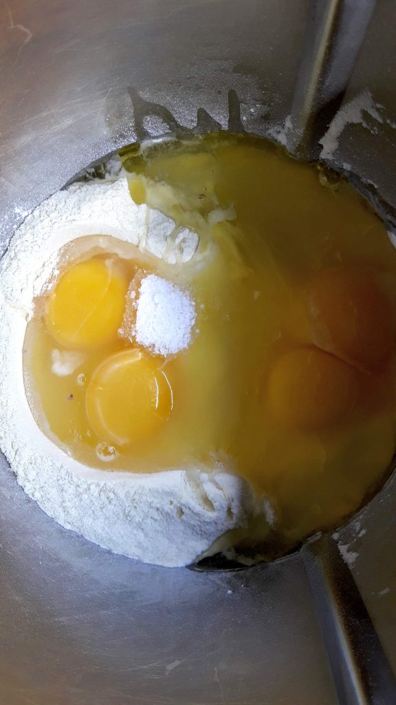 Pegue ambas as farinhas, a 00 e a de trigo duro nas quantidades, adicione os ovos, uma colher de chá de sal e uma colher de sopa de óleo.