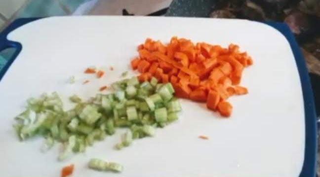 Em bastante água não salgada coloquei cenoura, cebola, talo de salsão e tomate.