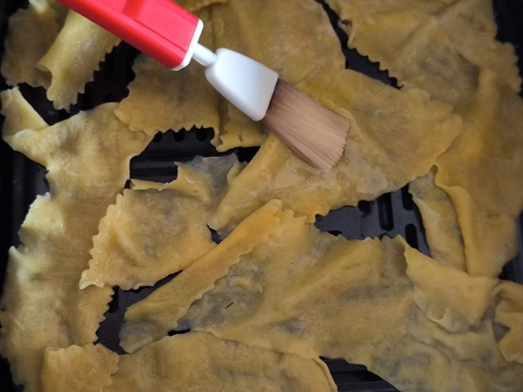 Divida a massa em pedaços, abra com a ajuda de um rolo, devem ficar bem fininhos. Aqueça água em uma panela e quando começar a ferver, mergulhe as folhas e quando subirem à superfície, escorra em papel manteiga e depois coloque no cesto da fritadeira.