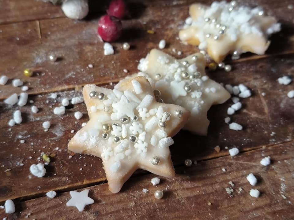 Aqui, fiz uma cobertura com açúcar de confeiteiro e água e decorei com bolinhas prateadas de açúcar e estrelinhas de açúcar