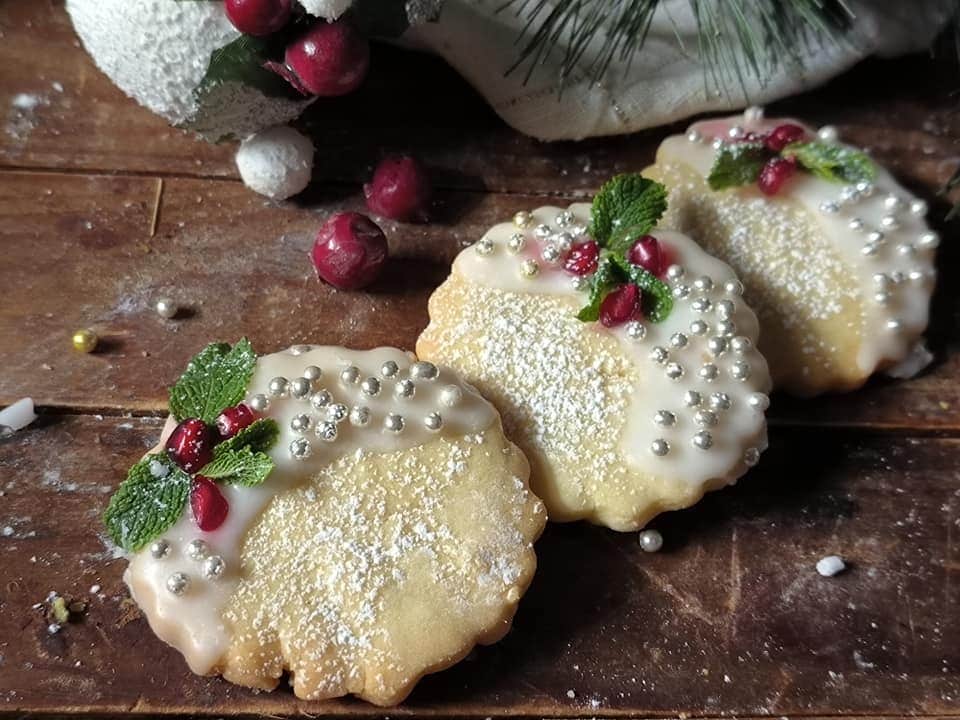Aqui, usei o cortador redondo, bolinhas de açúcar prateadas, sementes de romã e folhinhas de hortelã. Depois, fiz uma cobertura com açúcar de confeiteiro e água. Finalmente, polvilhei com açúcar de confeiteiro.