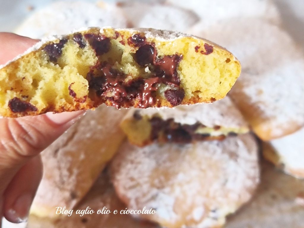 Em uma tigela grande, bata ligeiramente os ovos com o açúcar com um batedor manual ou uma colher, adicione todos os ingredientes e por último a farinha com o fermento peneirados. Misture bem e, por fim, adicione o chocolate picado. Forre com uma folha de papel manteiga uma assadeira e, com a ajuda de duas colheres, forme montinhos do tamanho que desejar, mas bem espaçados entre si, e leve ao forno a 180 graus por cerca de 15/20 minutos. Retire do forno e polvilhe com o açúcar de confeiteiro. Abaixo deixo algumas dicas