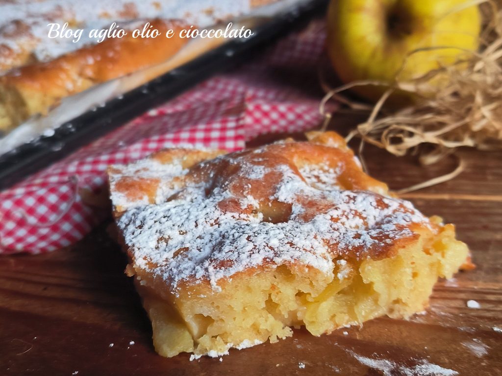 Lave as maçãs e corte em pedaços não muito pequenos. Pegue uma tigela e misture todos os ingredientes, você pode usar um batedor manual ou as batedeiras elétricas, forre uma forma retangular de cerca de 40×30 cm com papel manteiga, cubra o fundo com as maçãs e despeje toda a massa por cima, nivele bem e leve ao forno a 180 graus por cerca de 30 minutos, mas sempre ajuste com seu forno e faça o teste do palito. Retire do forno e polvilhe com o açúcar de confeiteiro