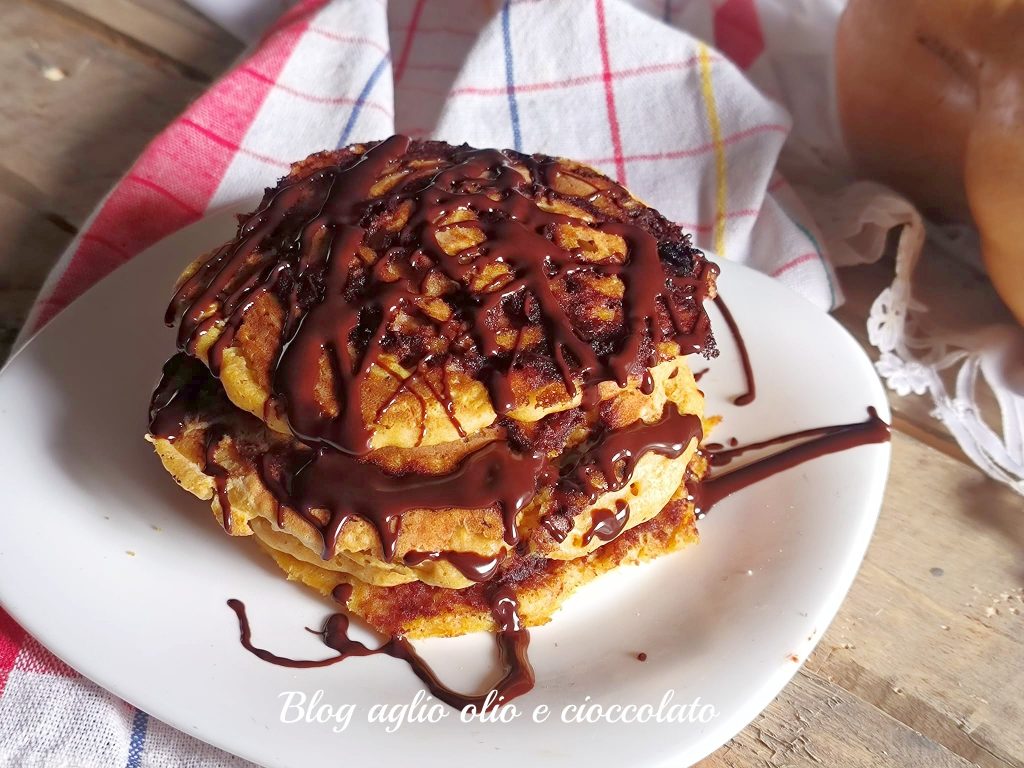 As panquecas de abóbora e canela, os famosos cinnamon roll pancakes, que se tornaram virais na web graças à sua espiral feita de canela, manteiga e cacau, e devo dizer que são incríveis. Fazia um tempo que esses deliciosos pancakes com esse redemoinho delicioso passavam na minha frente e como adoro panquecas, não pude resistir em experimentá-los e depois que vi a versão da Diletta Secco com abóbora, me apaixonei imediatamente e fiz na hora. Infelizmente, a foto não faz justiça, então com certeza farei novamente porque cobri com creme de avelãs de chocolate amargo para torná-los ainda mais deliciosos, enquanto a receita original prevê uma cobertura com glacê feito de açúcar de confeiteiro e água. Recomendo que experimente, tenho certeza de que conquistará você desde a primeira mordida. Vamos ver o que precisamos e como preparar as panquecas de abóbora e canela.