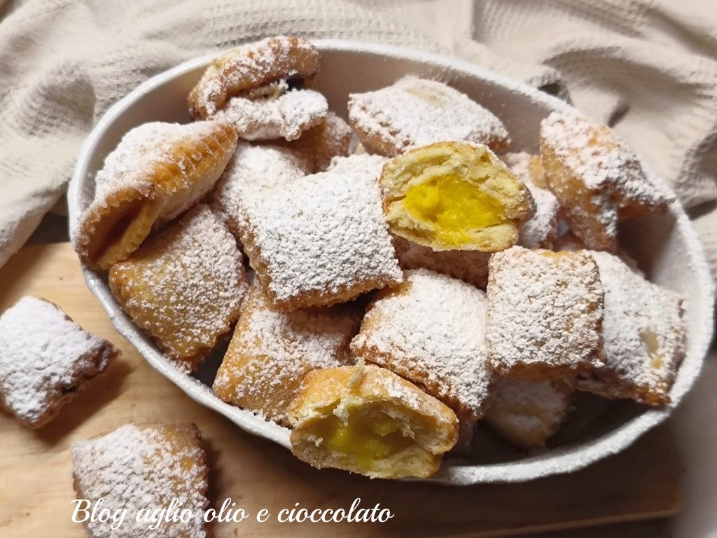 Ravioli doces com creme, uma sobremesa que sempre preparo durante o período de Carnaval junto com as frappe e as castagnole. Trata-se de uma massa muito semelhante a uma pasta frolla que permanece crocante por fora e muito cremosa por dentro, mas o que os torna muito especiais é justamente o creme firme que durante o cozimento não se dissolve, mas permanece sempre firme e cremoso. Os ravioli doces com creme, podem ser feitos tanto fritos quanto assados, mas se tornam duas receitas completamente diferentes, eu recomendo experimentá-los fritos e tenho certeza que vão conquistar você desde o primeiro momento. Agora vamos ver como se faz e o que precisamos para fazer os ravioli doces com creme.