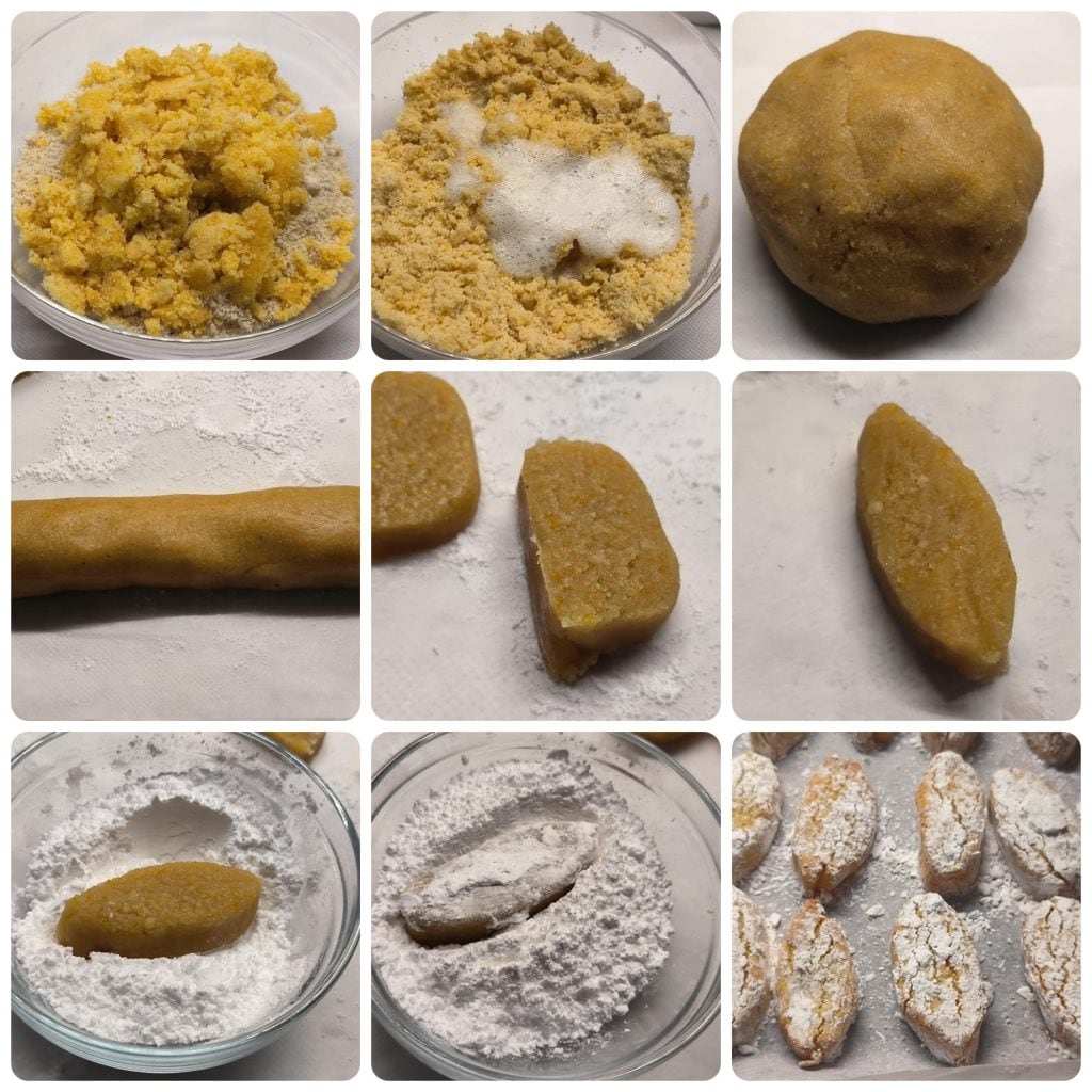 Para preparar estes deliciosos docinhos, primeiro coloque a farinha de amêndoas numa tigela grande. Descasque as laranjas, mas sem a parte branca, e triture-as junto com 60 g de açúcar retirado do total. Adicione as cascas de laranja trituradas à farinha, juntamente com o frasco de aroma de amêndoa, e misture. Prepare uma calda que servirá para unir. Coloque em uma panela o açúcar e a água, leve ao fogo baixo e deixe o açúcar derreter sem mexer. Enquanto isso, peneire 20 g de açúcar de confeiteiro e 20 g de farinha. Quando a calda estiver pronta, despeje-a na tigela com a farinha junto com a mistura de farinha e açúcar de confeiteiro peneirada e então adicione também o fermento e a amônia para bolos. A massa será muito úmida e esfarelada, é assim que deve ser. Cubra-a com um pano úmido e deixe descansar por 12 horas. Após as 12 horas, bata levemente as claras de ovo com um batedor de mão, quando começarem a formar pequenas bolhas, adicione-as ao resto dos ingredientes, comece a amassar com as mãos até que a mistura se compacte completamente. Polvilhe a superfície de trabalho com açúcar de confeiteiro, divida a massa em quatro partes e forme rolinhos grandes. Corte fatias de cerca de 1 cm de espessura e, com a ajuda das mãos, tente dar uma forma de losango ou gota. Coloque um pouco de amido de milho numa tigela. Mergulhe a base dos ricciarelli no amido de milho e a superfície no açúcar de confeiteiro que você terá colocado em outra tigela. Coloque todos os ricciarelli em uma assadeira coberta com papel manteiga e leve ao forno a 180 graus por 10/20 minutos. Os ricciarelli estarão prontos quando pequenas rachaduras se formarem na superfície. Nesse ponto, retire-os do forno e, se ainda estiverem um pouco moles, não se preocupe, deixe esfriar e eles adquirirão a consistência correta.