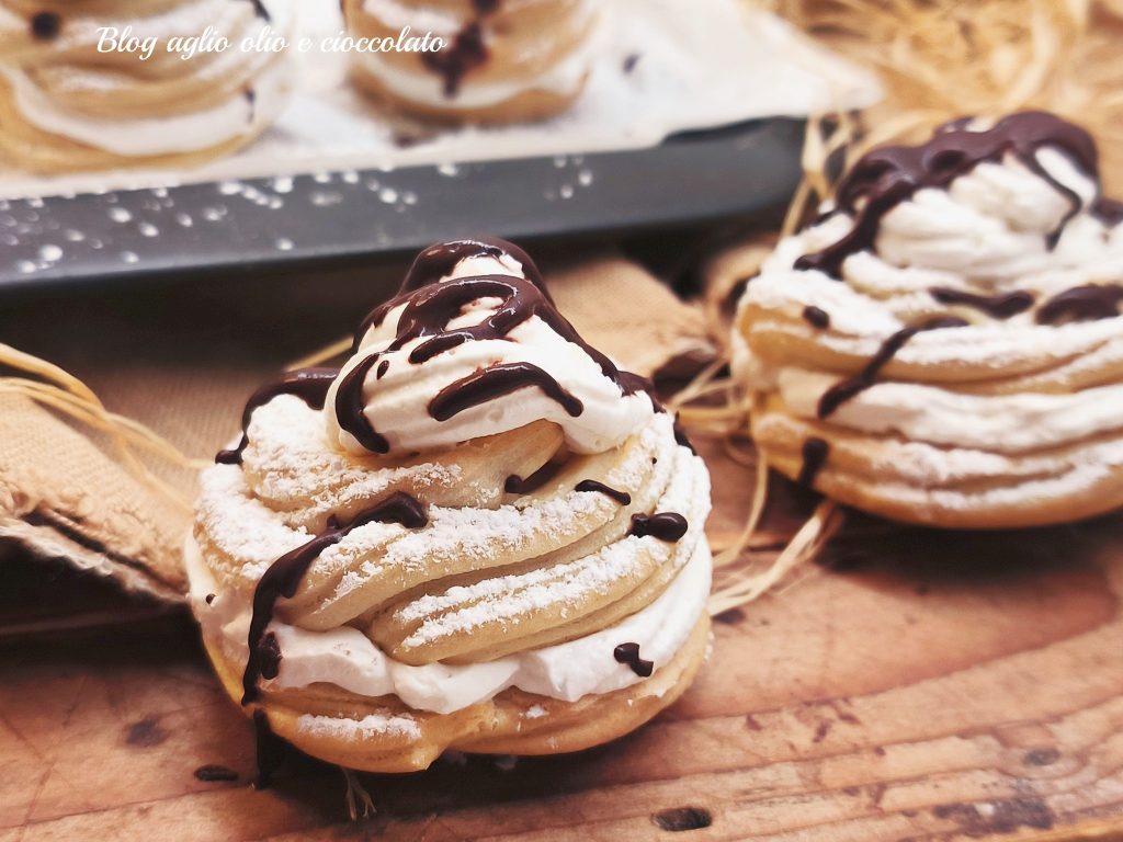 O CREME DE CHOCOLATE, PREPARE NO ÚLTIMO MOMENTO, SENÃO ELE FICA DURO, NUNCA ABRA O FORNO DURANTE O COZIMENTO DAS ZEPPOLE… A TEMPERATURA É FUNDAMENTAL: 200 GRAUS NOS PRIMEIROS 10 MINUTOS DEPOIS 180 POR MAIS 25 MINUTOS SE VOCÊ USAR VENTILADO 180 POR 10 MINUTOS E DEPOIS 160 POR MAIS 25 MINUTOS. A CONSISTÊNCIA SERÁ LEVEMENTE MAIS CROCANTE EM COMPARAÇÃO ÀS ZEPPOLE CLÁSSICAS, MAS CONSIDERE QUE UMA VEZ RECHEADAS ELAS AMOLECEM. SE A MASSA ESTIVER MUITO DURA, ENTÃO VOCÊ DEVE ADICIONAR MAIS UMA CLARA, ISSO PODE DEPENDER DO TAMANHO E DO PESO DOS OVOS