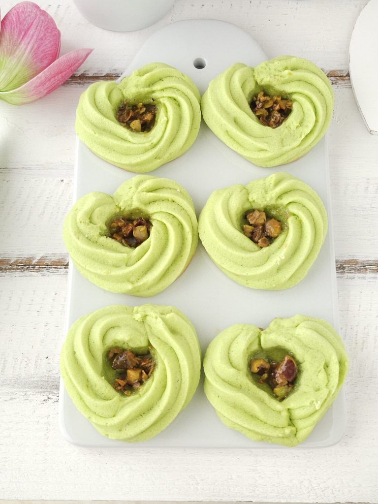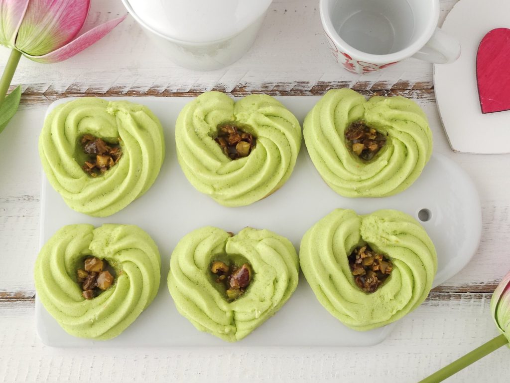Coloque a massa de frolla montada em um saco de confeitar com bico de estrela e faça biscoitos em forma de coração em uma assadeira forrada com papel manteiga. Coloque uma placa de pistache no centro de cada biscoito. Deixe a assadeira de biscoitos na geladeira por 1 hora. Asse em forno pré-aquecido a 180ºC por 12-15 minutos. Desligue o forno e deixe esfriar.